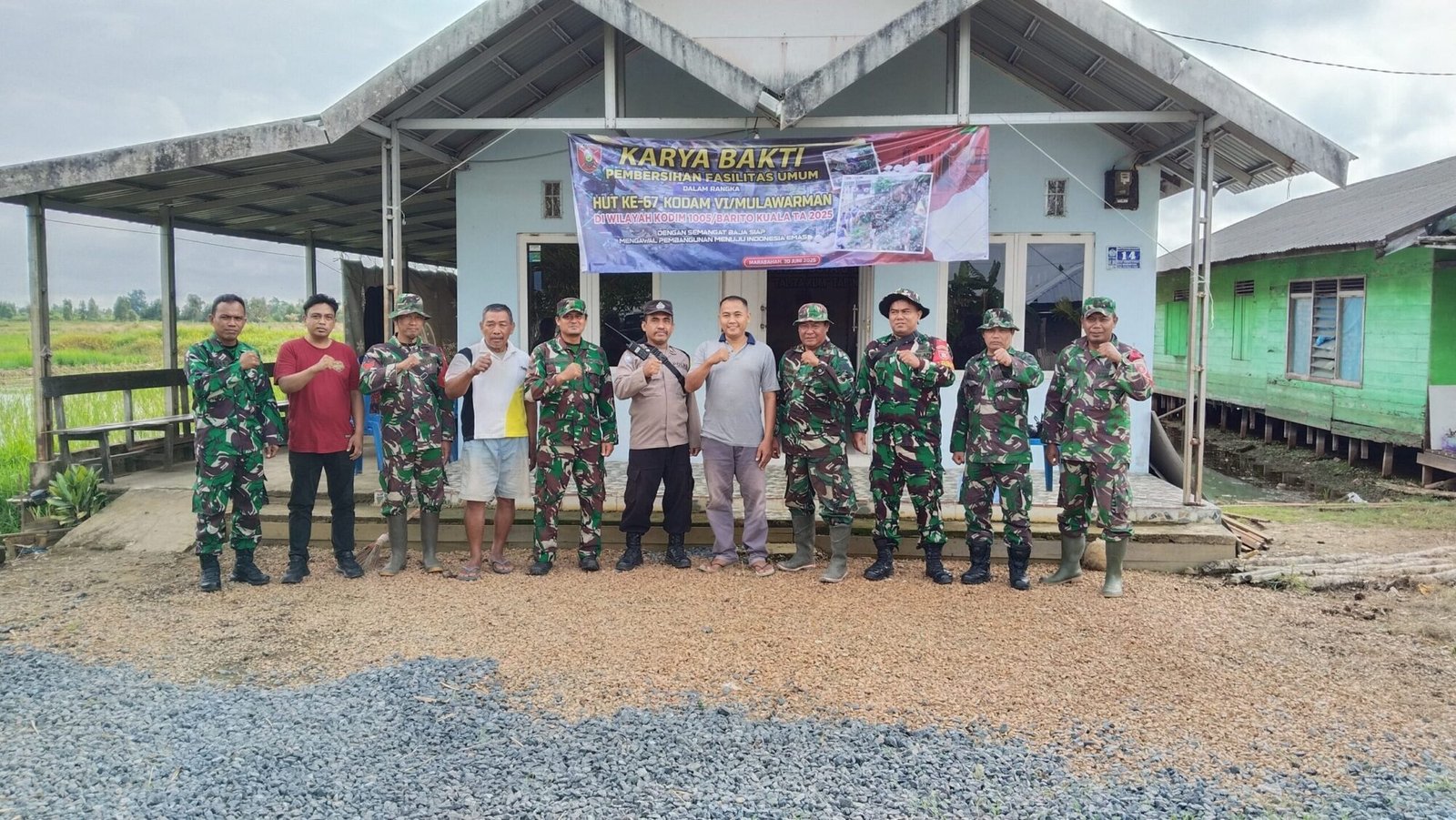 BARITO KUALA – Dalam rangka memperingati Hari Ulang Tahun (HUT) Kodam VI/Mulawarman yang ke-67, semangat kebersamaan dan kepedulian terhadap lingkungan serta tempat ibadah ditunjukkan oleh jajaran Kodim 1005/Barito Kuala. Pada hari Senin, 30 Juni 2025, personel TNI dari Pos Jejangkit bersama dengan elemen masyarakat setempat secara antusias melaksanakan kegiatan karya bakti pembersihan Gereja Pantai Kosta yang berlokasi di Desa Tabing Rimbah, Kecamatan Mandastana, Kabupaten Barito Kuala.