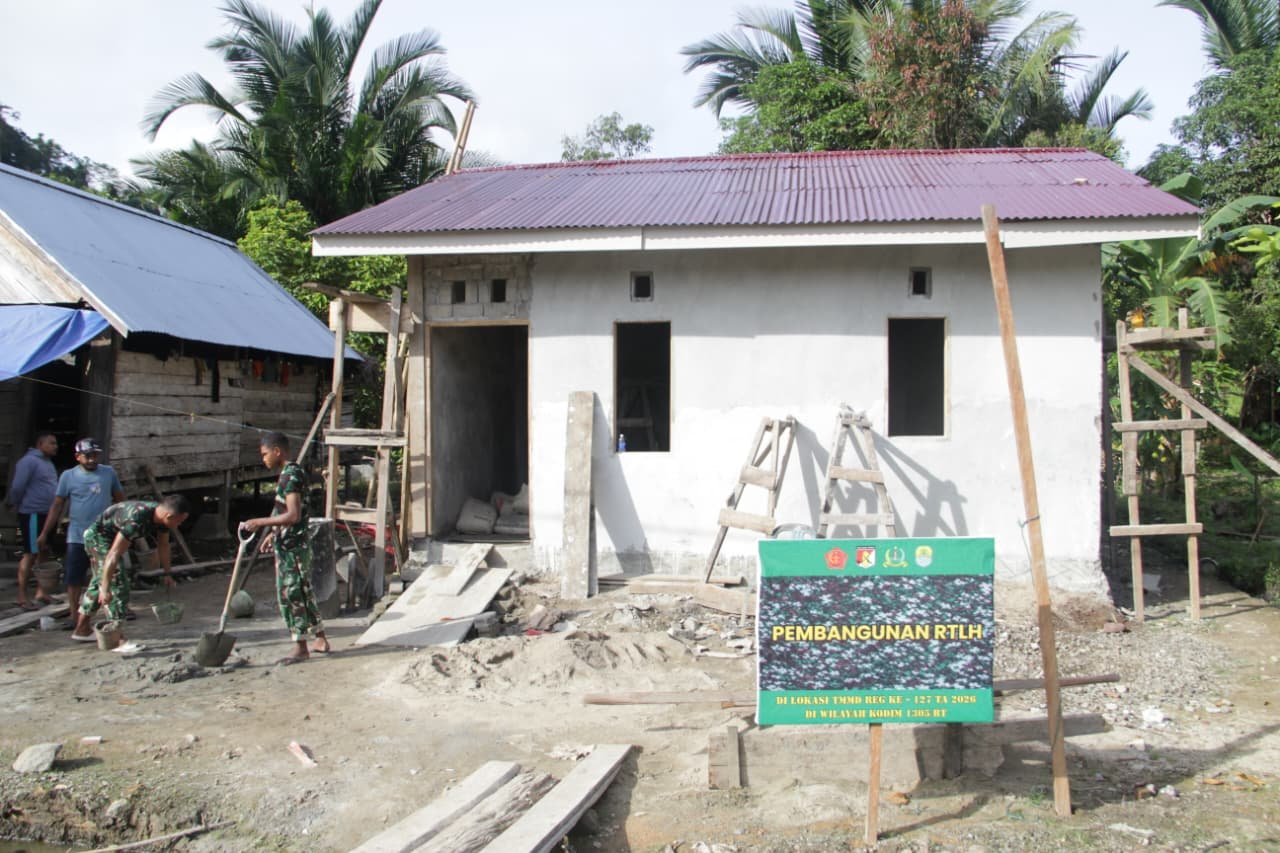 Anggota Satgas TMMD dari Kodim 1305/BT terlihat bahu-membahu bersama warga setempat dalam proses pengerjaan rumah. Suasana gotong royong tampak kental, mulai dari pengangkutan material hingga pengerjaan struktur bangunan.
