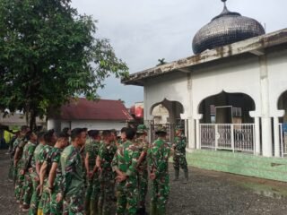 Anggota Satgas TMMD dari Kodim 1305/BT terlihat bahu-membahu bersama warga setempat dalam proses pengerjaan rumah. Suasana gotong royong tampak kental, mulai dari pengangkutan material hingga pengerjaan struktur bangunan.