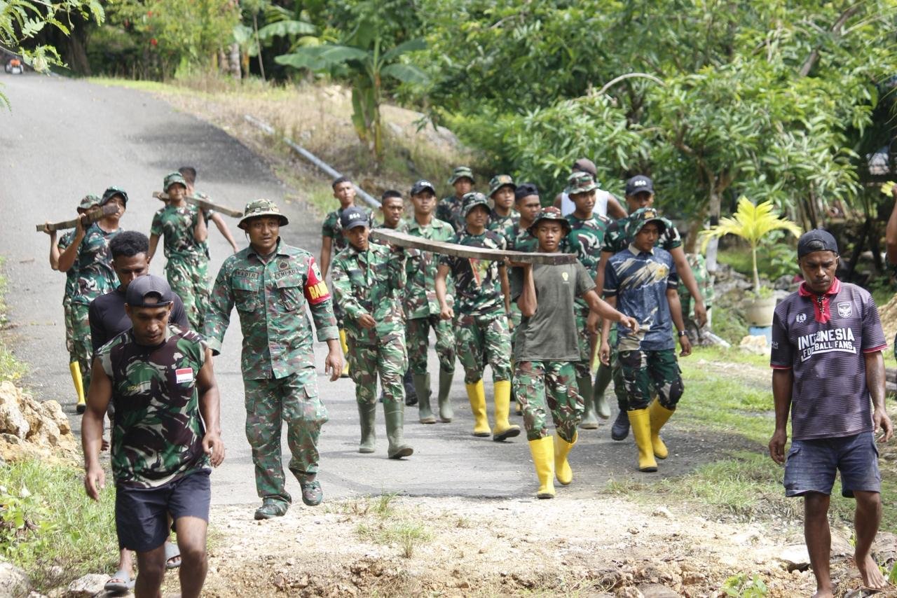 Kaimana – Satgas TMMD 127 Kodim 1804/Kaimana kembali menunjukkan momen kebersamaan dan semangat gotong royong bersama masyarakat dalam kegiatan pemindahan balok jembatan di Kmp Marsi pada 01/03/2026.