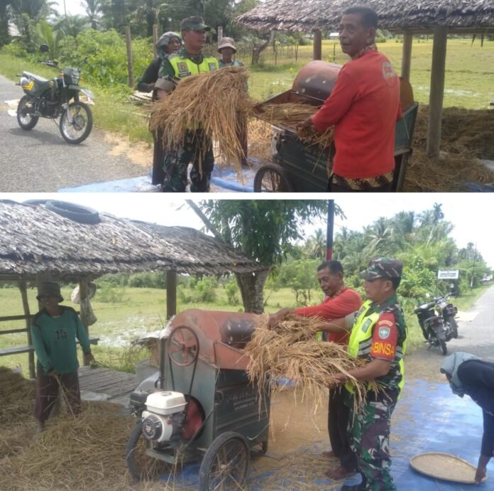 ACEH BARAT – Wujud kepedulian terhadap masyarakat desa binaan kembali ditunjukkan oleh Babinsa Koramil 10/Woyla Barat, Kodim 0105/Aceh Barat. Serda Hendri Saputra terjun langsung membantu petani merontokkan padi milik warga di Desa Blang Luah, Kecamatan Woyla Barat, Kabupaten Aceh Barat, Selasa (14/4/2026).