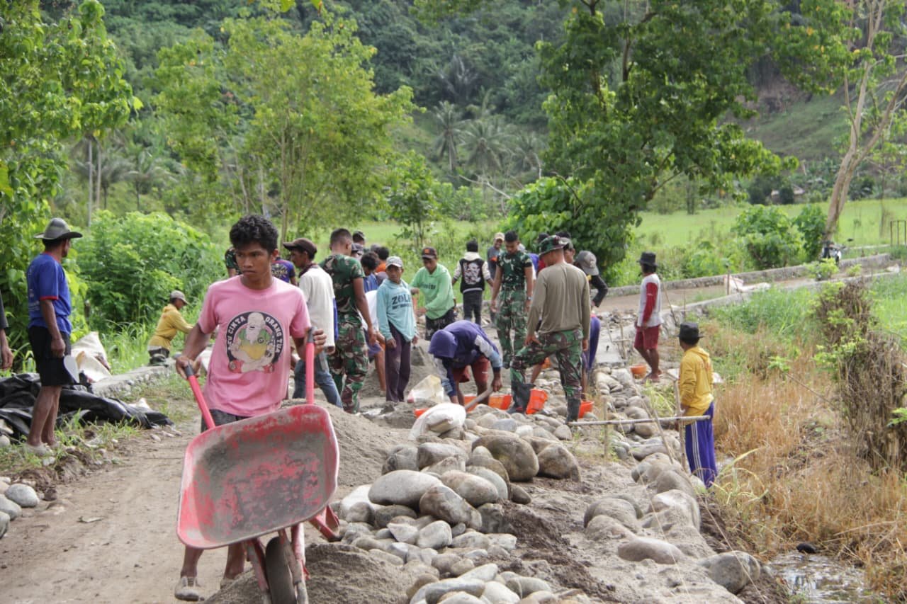 Di lapangan, terlihat sinergi yang solid antara TNI dan warga. Mereka bahu-membahu mulai dari pengangkutan material, perataan badan jalan, hingga penyusunan batu untuk talud penahan tanah. Semangat gotong royong tampak jelas sebagai wujud nyata kemanunggalan TNI dan rakyat.