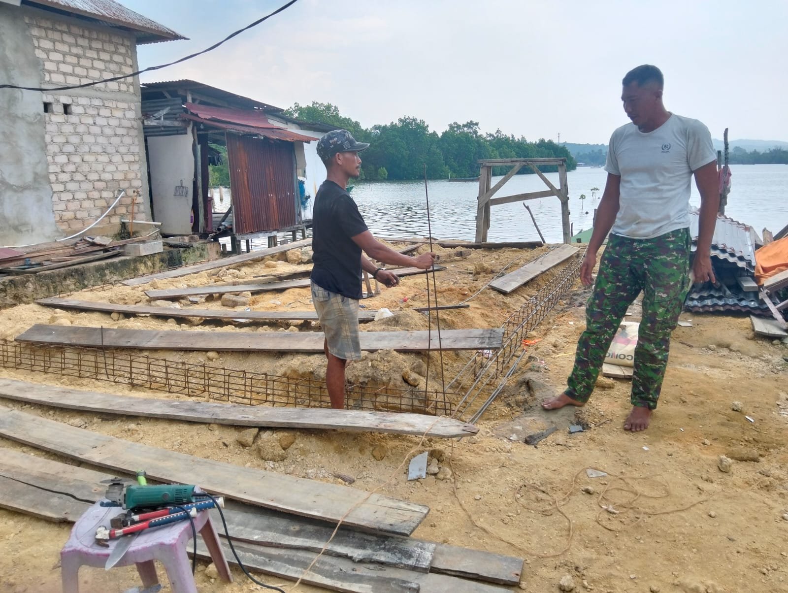 Pada tahap terbaru, personel Satgas bersama warga mulai merakit dan memasang besi tulangan yang akan menjadi fondasi utama bangunan rumah.