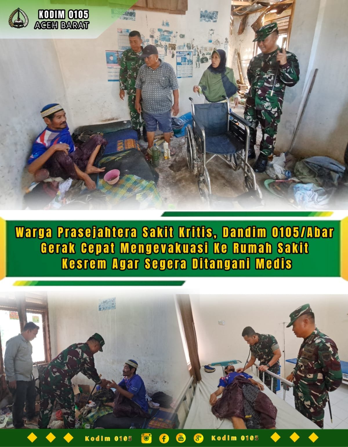 ACEH BARAT – Guna mempercepat penanganan medis kepada warga binaan yang sakit kritis, Dandim 0105/Abar Letkol Inf S. Kembaren, S.E., M.I.P., CFrA., turun langsung menjemput dan mengevakuasi warga ke Rumah Sakit Kesrem TK IV IM 07.02 Teuku Umar yang beralamat di Jalan Pocut Baren, Ujong Karang, Kecamatan Johan Pahlawan, Sabtu (7/2/2026).