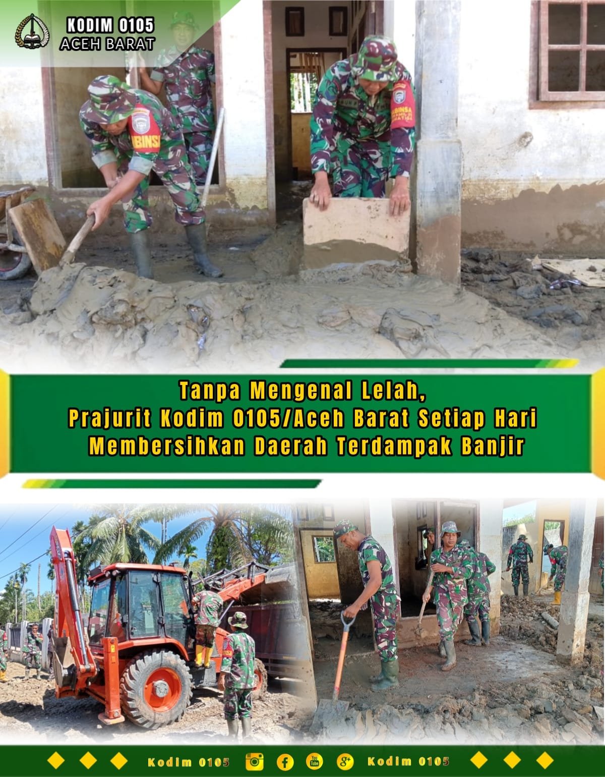 Komandan Kodim 0105/Aceh Barat, Letkol Inf S. Kembaren, S.E., M.I.P., CFrA., memerintahkan seluruh jajaran untuk melakukan pembersihan pascabencana di Desa Pasi Birah, Kecamatan Woyla, Kabupaten Aceh Barat.