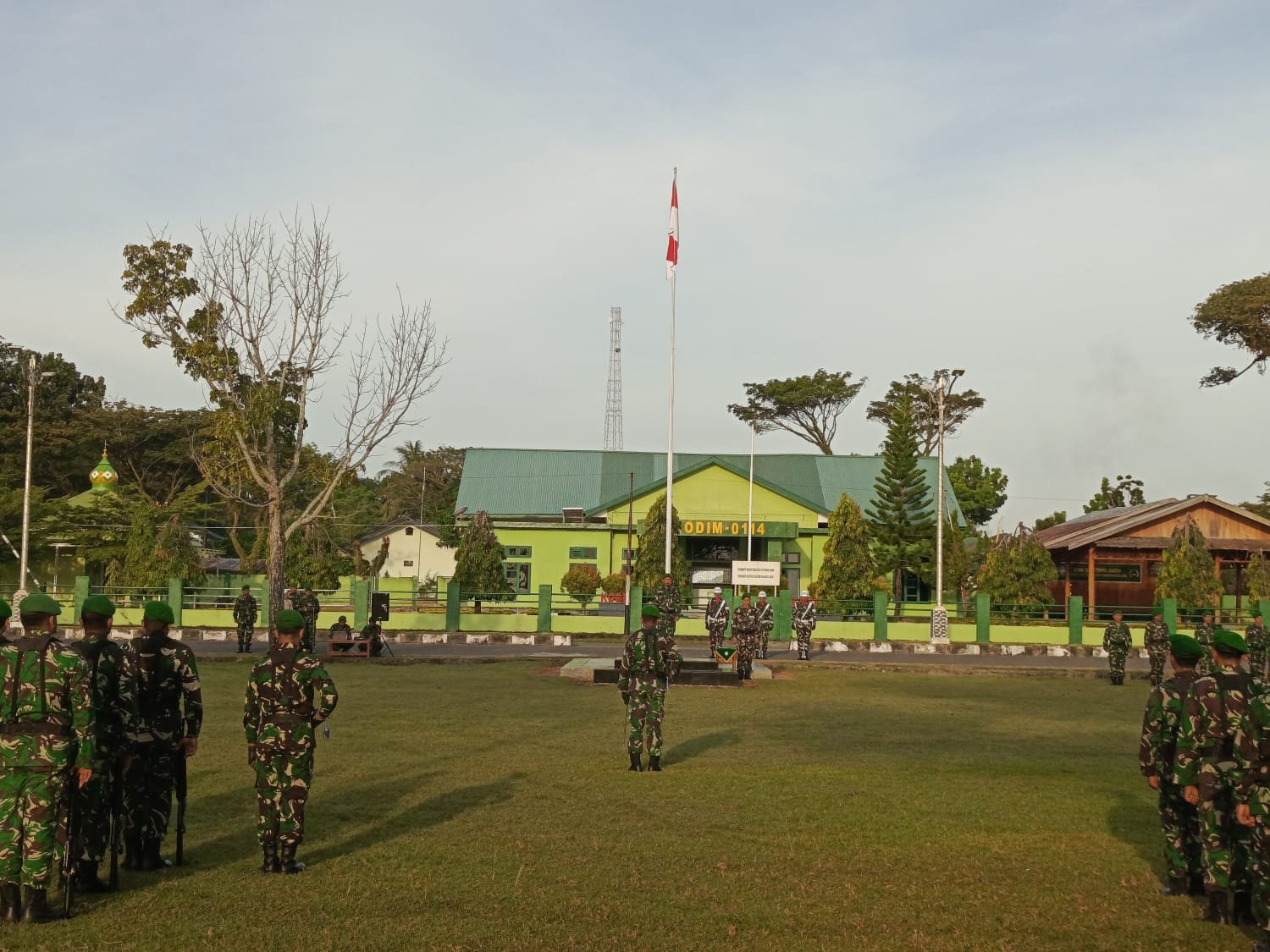 ACEH JAYA — Kodim 0114/Aceh Jaya melaksanakan Upacara Pengibaran Bendera Merah Putih Bulanan yang digelar di Lapangan Upacara Kodim 0114/Aceh Jaya, Desa Bahagia, Kecamatan Krueng Sabee, Kabupaten Aceh Jaya, Senin (19/01/2026).