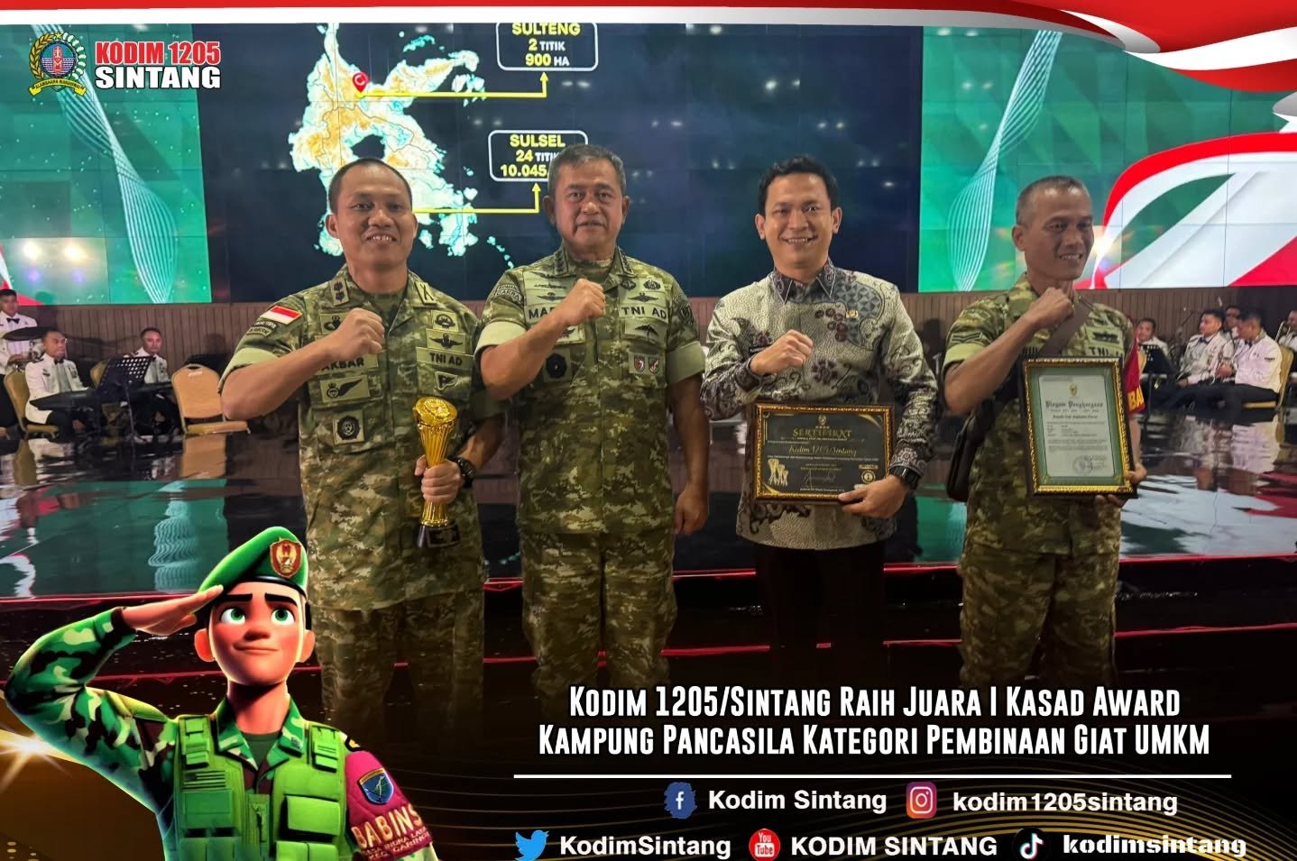 Jakarta – Kodim 1205/Sintang sebagai perwakilan Kodam XII/Tanjungpura berhasil meraih Juara I Kasad Award Kampung Pancasila 2025 pada Kategori Pembinaan Giat UMKM. Penghargaan tersebut diberikan langsung oleh Kepala Staf Angkatan Darat (KSAD) Jenderal TNI Maruli Simanjuntak dalam acara penganugerahan yang digelar di Markas Besar TNI AD (Mabesad), Jakarta, Jumat (19/12/2025).