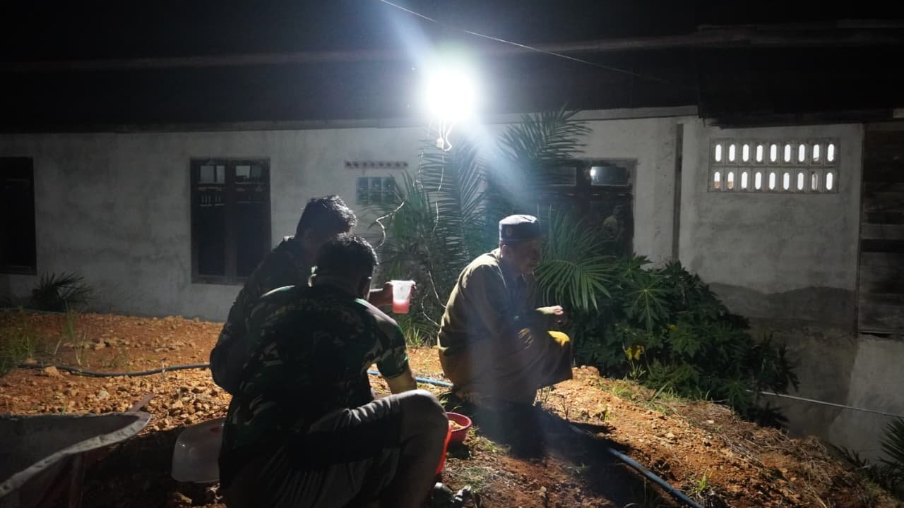 Kotawaringin Timur – Suasana penuh keakraban terlihat dalam kegiatan TMMD Reguler ke-127 Kodim 1015/Sampit di Desa Tri Buana, Kecamatan Telaga Antang. Di sela-sela kegiatan lembur pembuatan sumur bor, anggota TNI bersama warga tampak duduk santai menikmati kopi dan gorengan, Sabtu malam (07/03/2026).