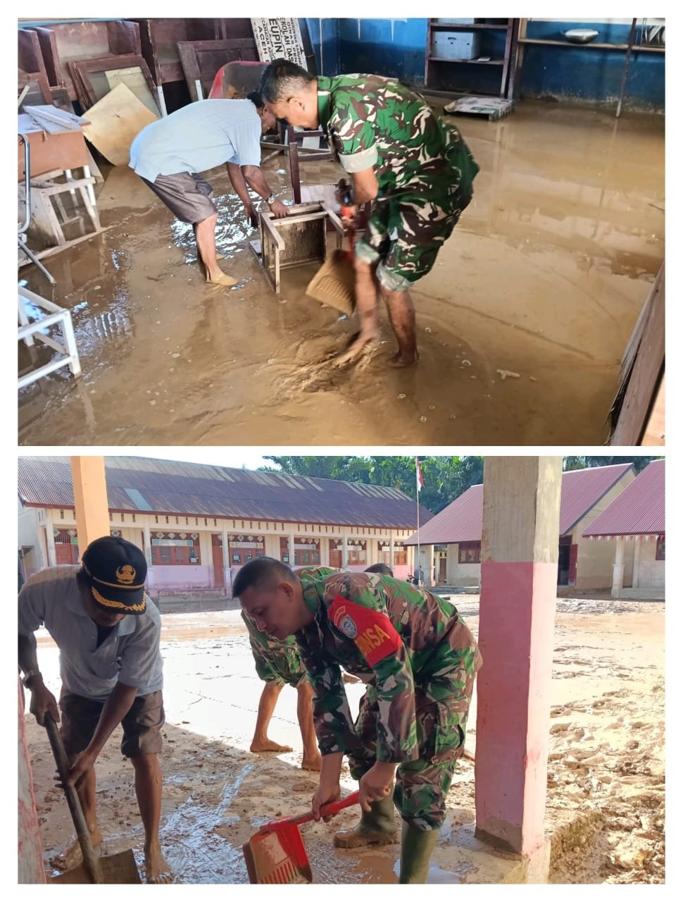 Pembersihan dilakukan sebagai bentuk kepedulian TNI terhadap sarana pendidikan serta upaya mempercepat pemulihan agar kegiatan belajar mengajar dapat kembali berjalan normal. Personel Koramil bersama para guru dan warga bahu-membahu membersihkan ruang kelas, halaman sekolah, serta mengangkut lumpur dan sampah yang terbawa arus banjir.