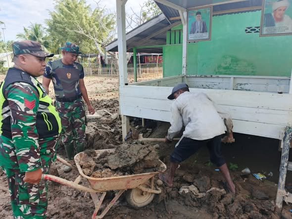 Kegiatan gotong royong ini difokuskan pada pembersihan lumpur dan kotoran yang terbawa arus banjir dan mengendap di area balai pengajian, sehingga mengganggu aktivitas ibadah dan kegiatan keagamaan masyarakat. Anggota Koramil bersama warga setempat bahu-membahu membersihkan lokasi agar dapat segera digunakan kembali.