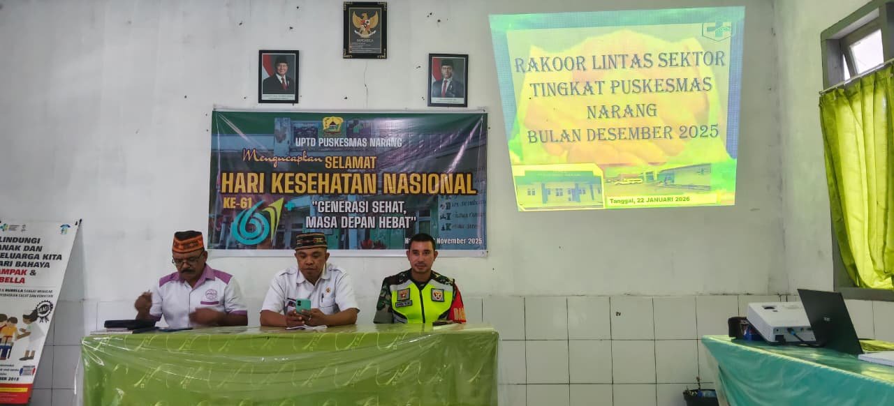 Satarmese Barat – Dalam rangka meningkatkan derajat kesehatan dan pelayanan kesehatan masyarakat, anggota Koramil 1612-05/Satarmese, Serda Junaidin dan Pratu Gregorius Juang, menghadiri kegiatan rapat koordinasi lintas sektor tingkat Puskesmas Narang, yang digelar pada Kamis, 22 Januari 2026, bertempat di Aula Puskesmas Narang, Desa Hilihintir, Kecamatan Satarmese Barat.
