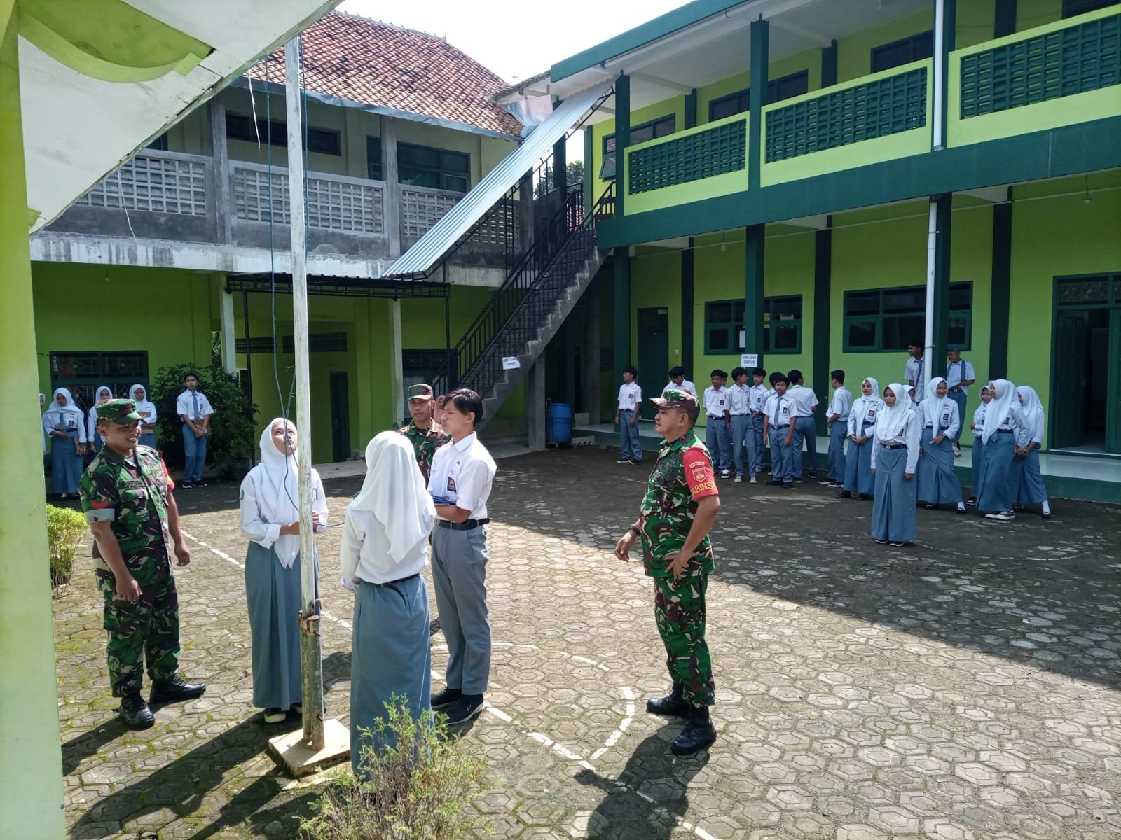 Batang,- Anggota Koramil 06/Tersono Kodim 0736/Batang yang dipimpin Serka Harry Prianto memberikan pelatihan Tata Upacara Bendera kepada siswa-siswi SMA Wahid Hasyim Tersono, Batang, Rabu (16/4/2025).
