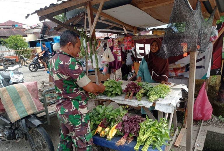 ABDYA – Babinsa Koramil 04/Susoh Kodim 0110/Abdya, Serda Nasir, melakukan pemantauan perkembangan harga pangan dan sayuran di sejumlah pasar tradisional di wilayah Susoh, Jumat (28/11/2025).