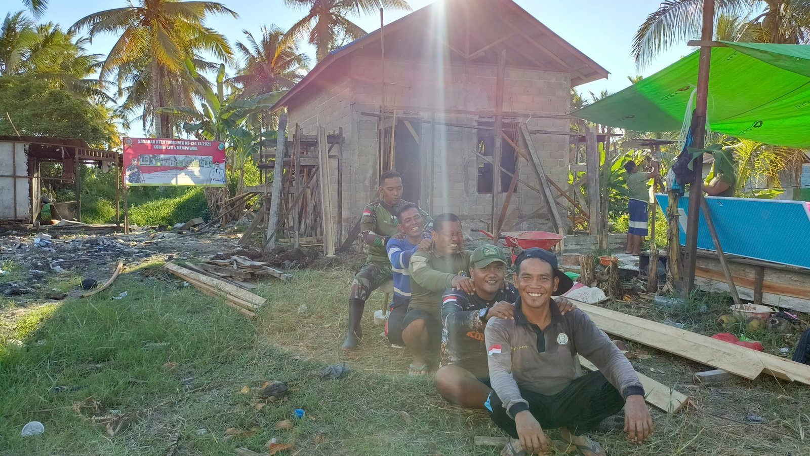 Dengan semangat kebersamaan, anggota Satgas bersama warga terus melanjutkan pekerjaan tanpa mengenal cuaca. Pengerjaan tugu TMMD menjadi simbol dedikasi TNI bersama masyarakat dalam membangun desa.