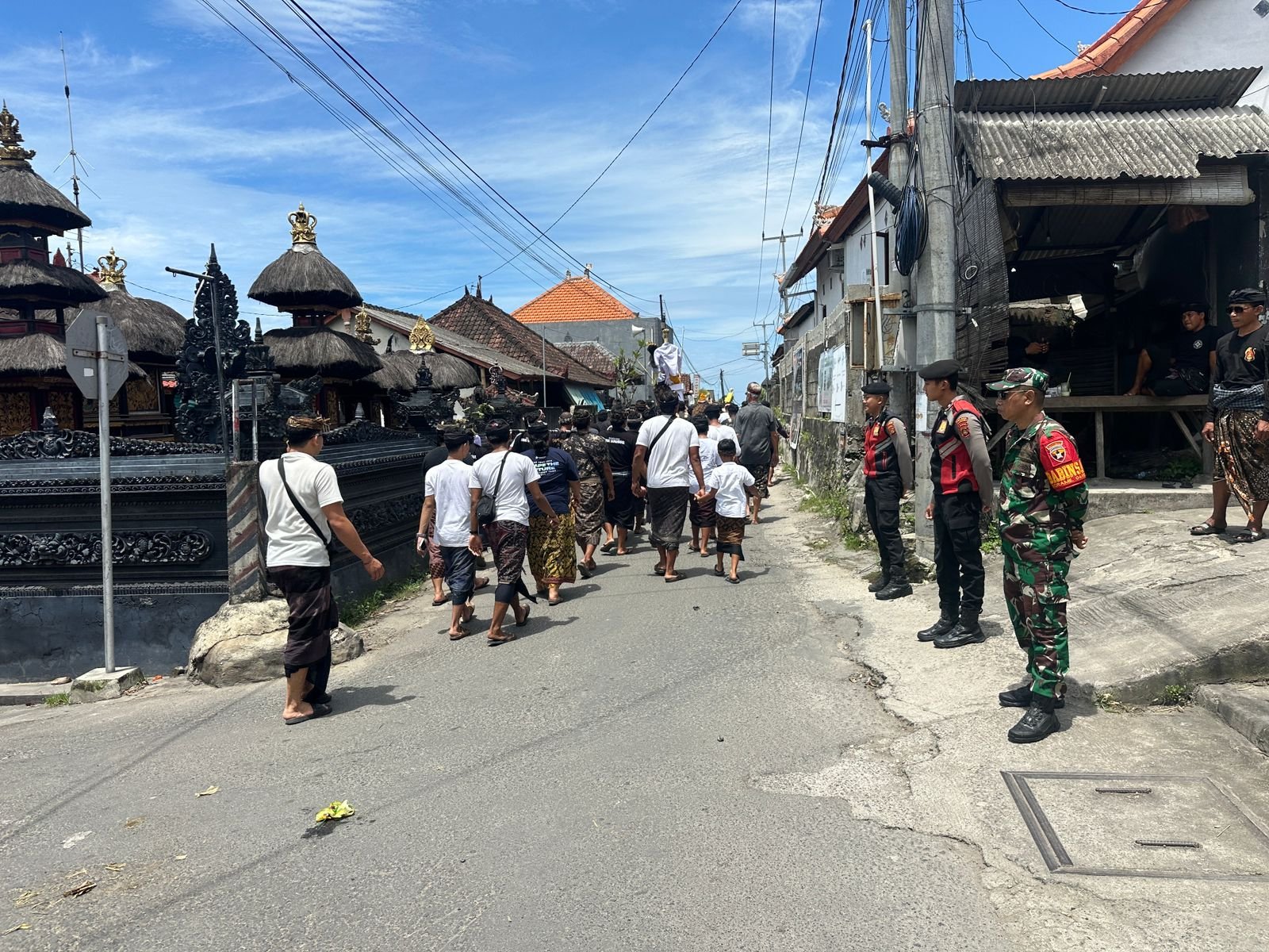 Sebagai upaya untuk memastikan jalannya upacara ini aman, tertib dan lancar, bersinergi bersama Bhabinkamtibmas dan pecalang kita lakukan pengawalan dan pengamanan bersama.