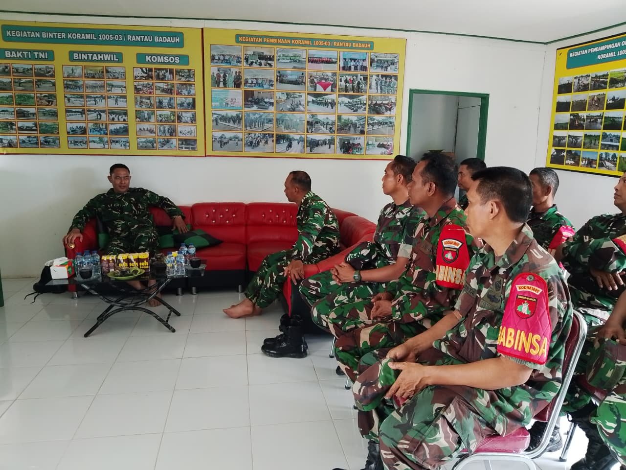 Kunjungan pertama dilakukan di Koramil 1005-03/Rantau Badauh. Kedatangan Dandim disambut hangat oleh Danramil Kapten Inf Samsudin beserta seluruh anggota. Dalam arahannya, Dandim menekankan kembali pentingnya pemahaman terhadap tugas pokok sebagai aparat kewilayahan.