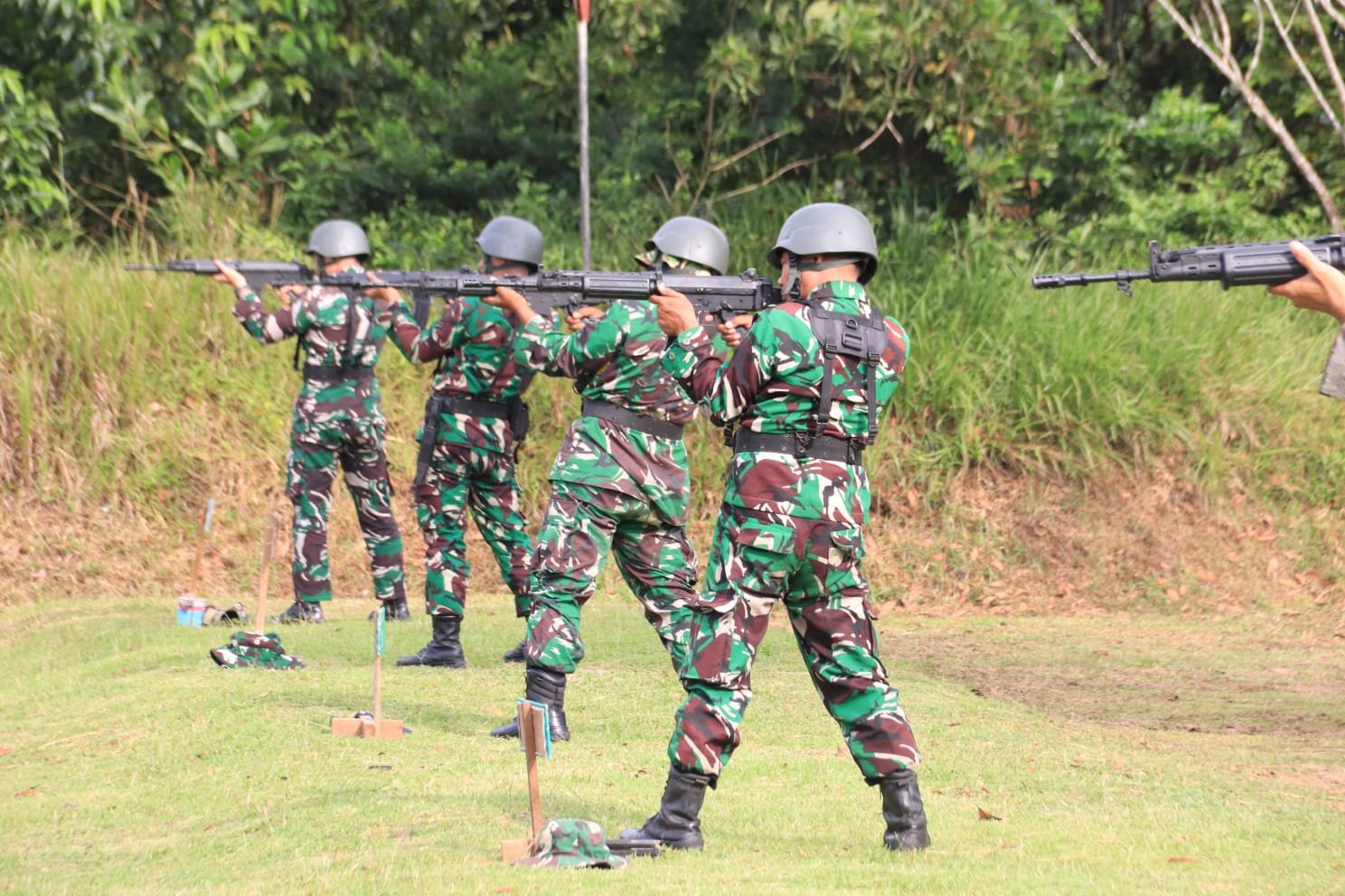 Latihan menembak menggunakan senjata laras panjang jenis SS1 dengan munisi kaliber 5,56 mm. Materi menembak dilaksanakan dengan tiga sikap, yaitu tiarap, duduk, dan berdiri. Pola latihan ini dirancang untuk melatih ketepatan, konsentrasi, serta kesiapan mental prajurit dalam berbagai kondisi, sehingga kemampuan dasar menembak dapat terpelihara secara optimal.