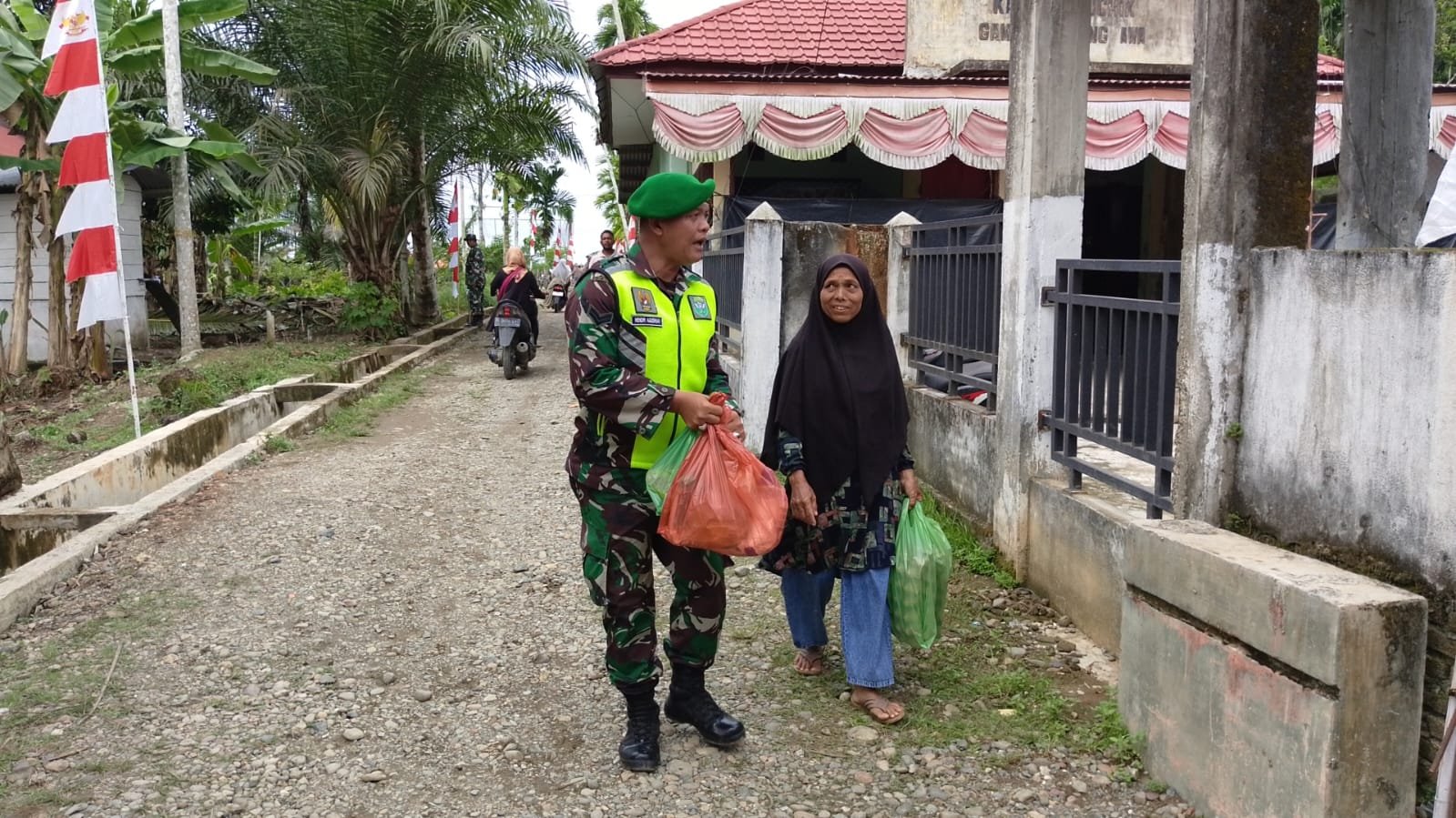 Beberapa prajurit bahkan terlihat membantu warga membawa sembako menuju kendaraan mereka.