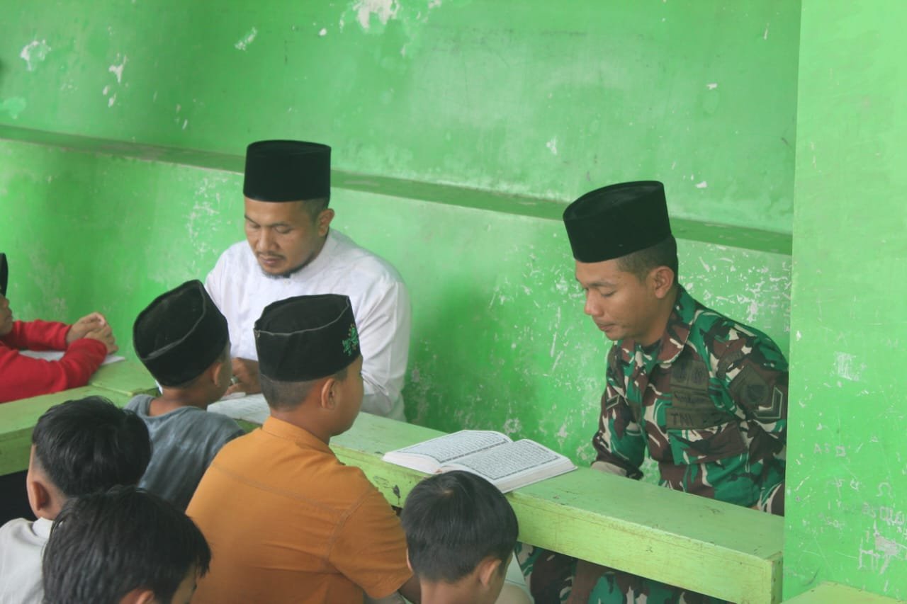 Duduk bersila bersama para santri, Serda Khairul M membimbing bacaan huruf-huruf hijaiyah dengan penuh kesabaran. Suasana belajar terasa hangat dan penuh keakraban. Kehadiran prajurit berseragam loreng di tengah anak-anak menghadirkan semangat baru, terlebih menjelang bulan suci Ramadhan.