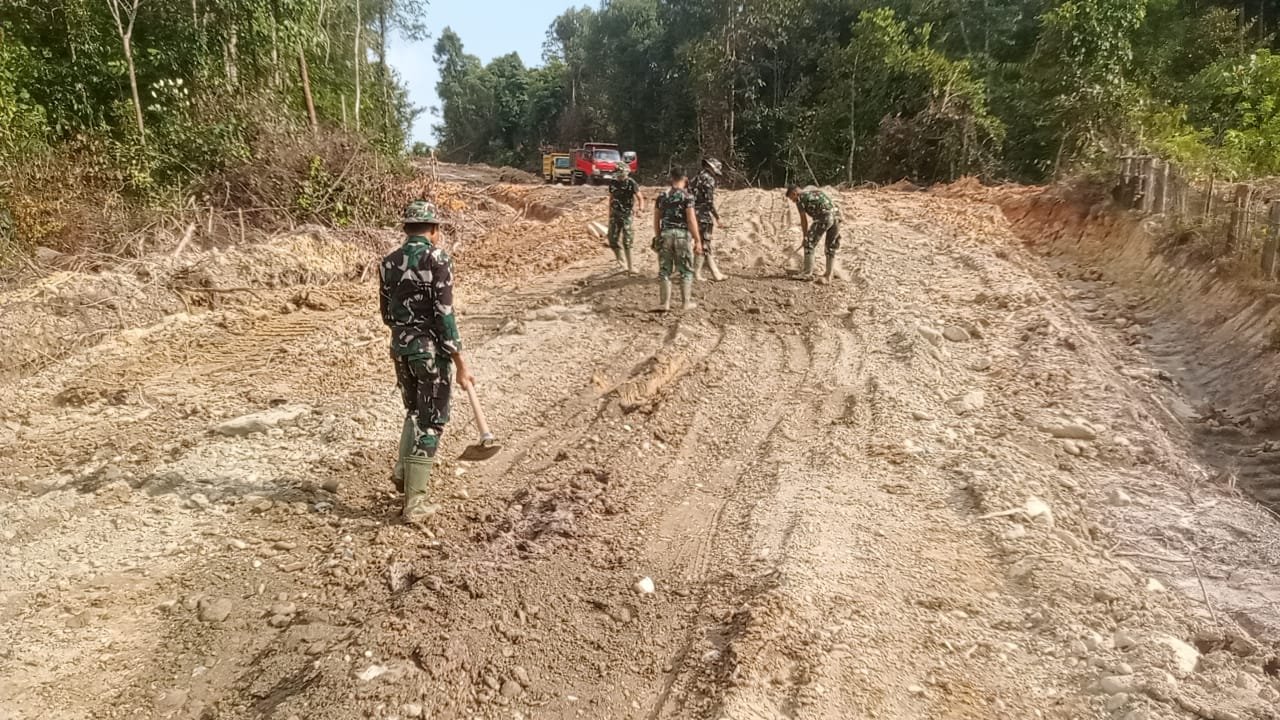 Di lokasi terlihat perpaduan kerja alat berat dan tenaga manusia. Excavator membentuk badan jalan, sementara prajurit memperbaiki bagian yang masih tidak rata.