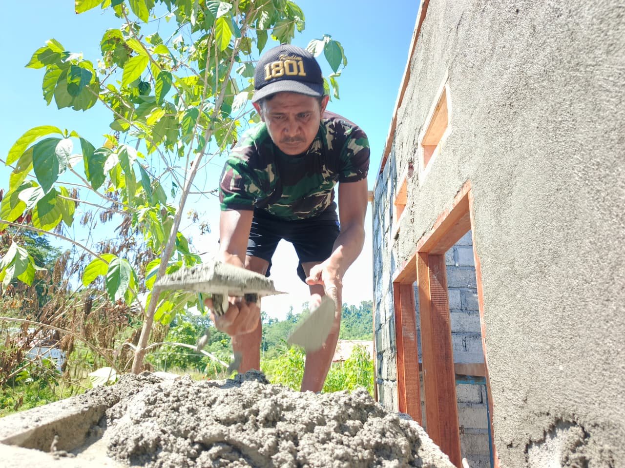 Personel Satgas TMMD bersama warga terlihat bekerja secara maksimal, memastikan setiap bagian dinding diplester dengan baik agar hasilnya kuat dan tahan lama.