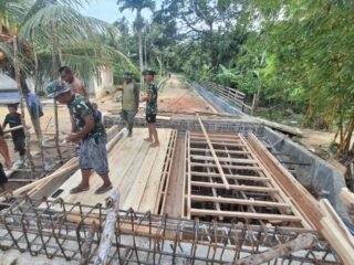 Sejak pagi, warga bersama anggota Satgas bahu-membahu mengangkut pasir, kerikil, dan semen ke lokasi kerja. Mereka bekerja dengan penuh semangat tanpa mengenal lelah, menunjukkan kekompakan dan rasa kebersamaan yang menjadi ciri khas kemanunggalan TNI dan rakyat.