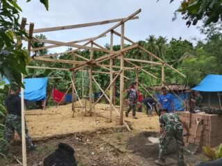 Anggota Satgas TMMD bersama masyarakat tampak kompak menurunkan material kayu yang diangkut menggunakan kendaraan dinas TNI. Semangat gotong royong terlihat jelas saat proses pembongkaran dilakukan secara bersama-sama di lokasi pembangunan.