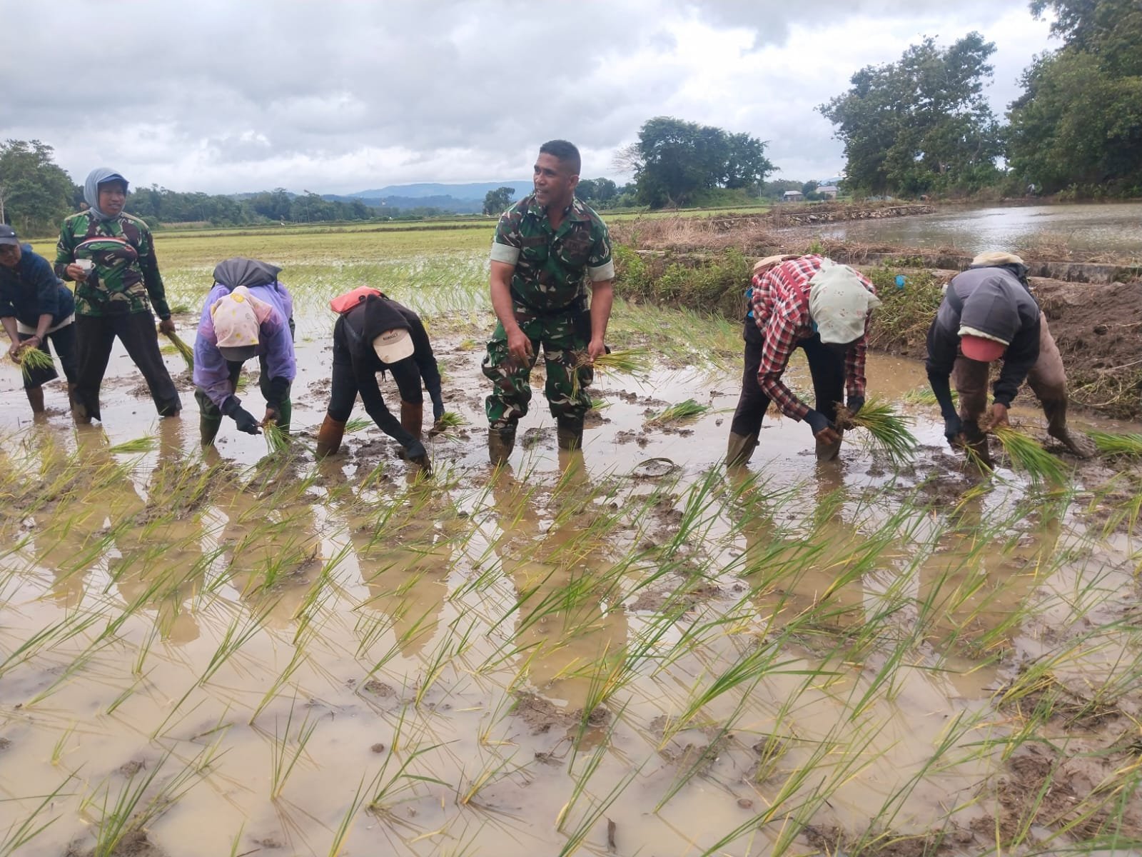Dengan turun langsung ke sawah dan ikut menanam padi bersama warga, Babinsa berperan aktif membantu serta memberikan motivasi kepada para petani.