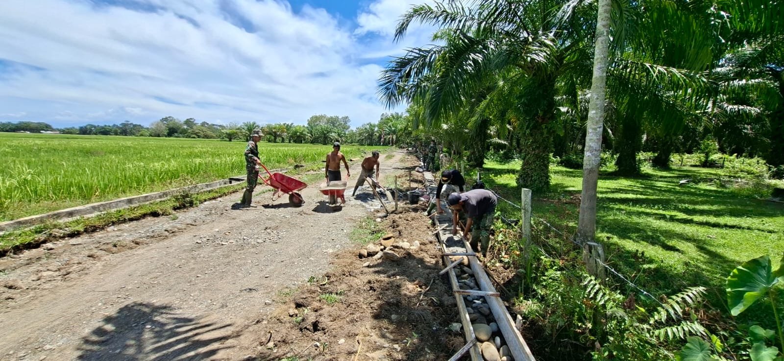 Sejak pagi, para prajurit sibuk mengukur, memasang rangka, mengaduk semen, hingga memastikan setiap sudut talud tersusun rapi. Tidak ada keluhan, yang ada hanya komitmen untuk menyelesaikan pekerjaan dengan baik.