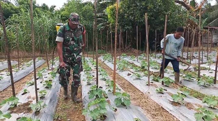 Pendim 0428/MukoMuko – Bantu petani menyemprot hama tanaman Timun di Kelurahan Koto Jaya, Kecamatan Kota MukoMuko, Kabupaten MukoMuko, Selasa(20/01/2026).
