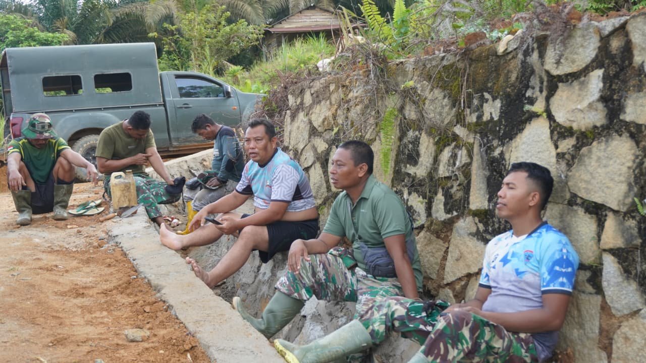Meski aktivitas fisik cukup menguras tenaga, anggota Satgas tetap menjaga komunikasi sosial dengan masyarakat. Interaksi sederhana tersebut justru memperkuat kedekatan emosional antara TNI dan warga.