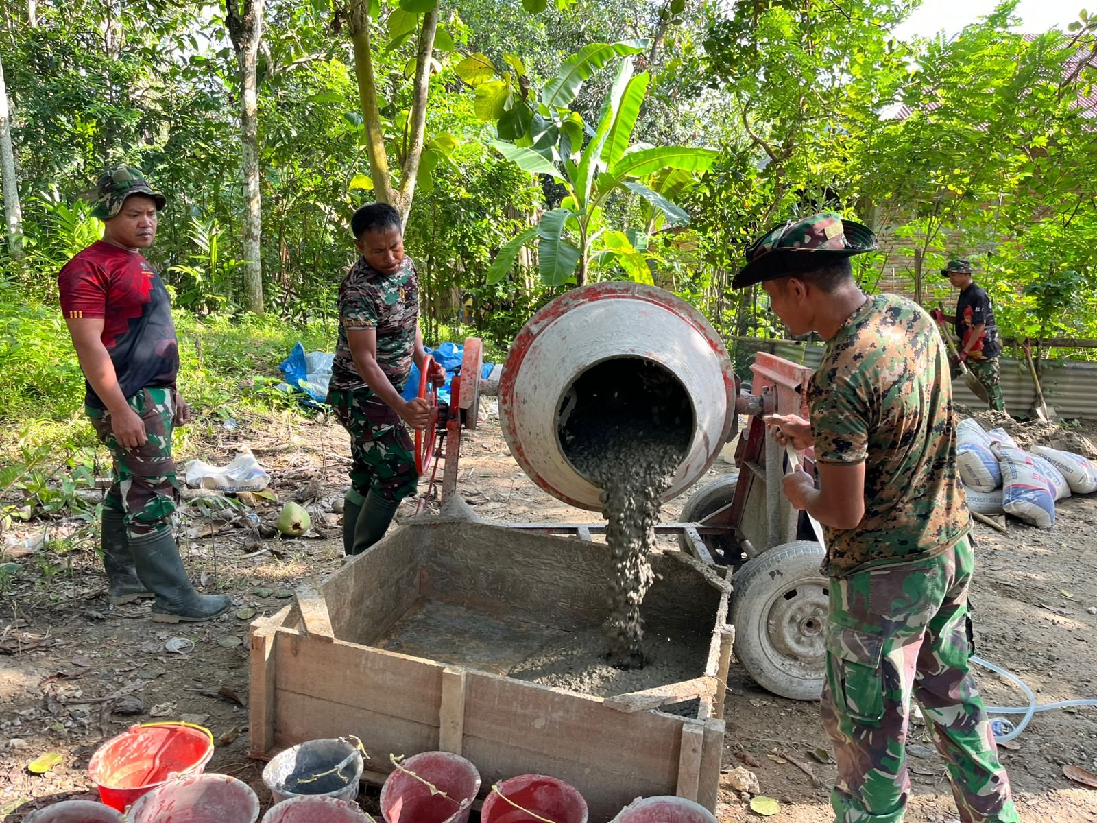 Meski cuaca di lapangan cukup menantang, para personel Satgas bersama warga tetap menunjukkan semangat tinggi dalam mengoperasikan peralatan dan menyusun material konstruksi.