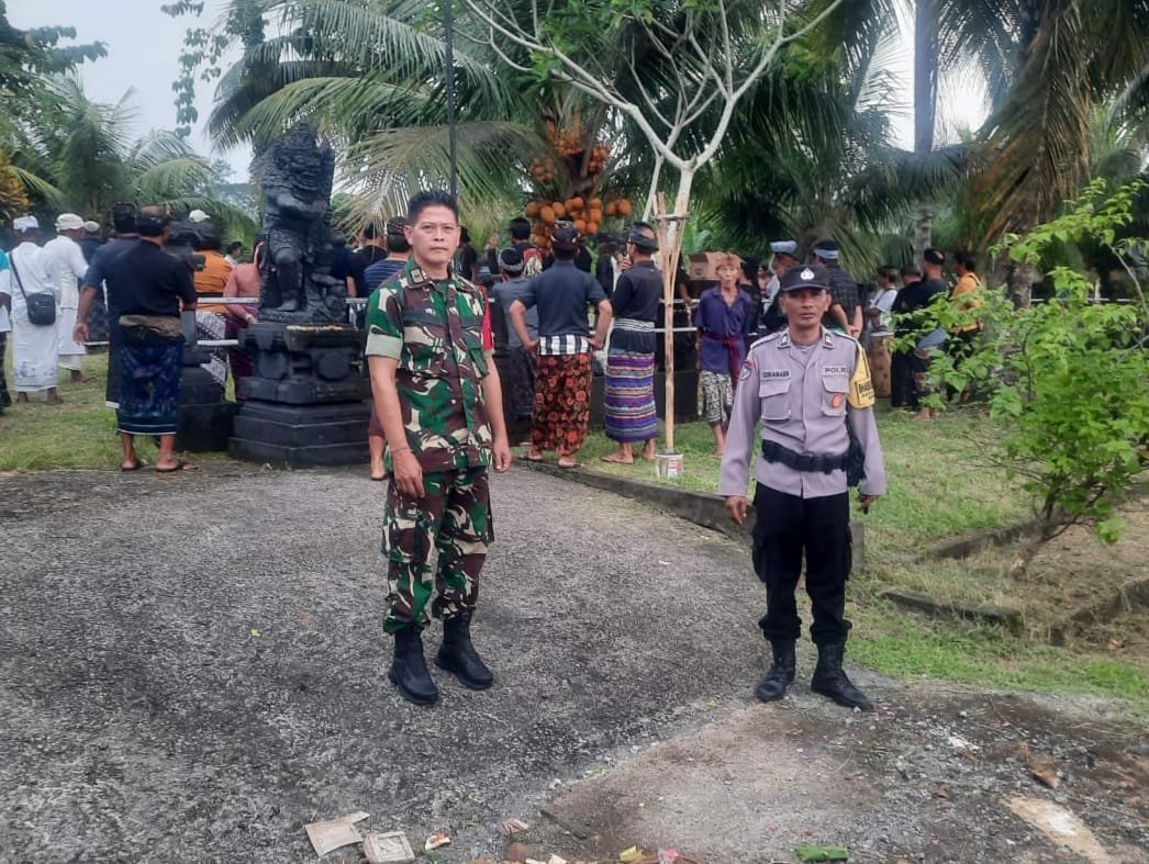 Klungkung,- Puluhan aparat keamanan, TNI dan Polri serta pecalang tampak sigap dan siaga memberikan pelayanan pengamanan pada puncak upacara keagamaan pitra yadnya ngaben masal Desa Adat Batukandik, Minggu ( 20/07/25 ).