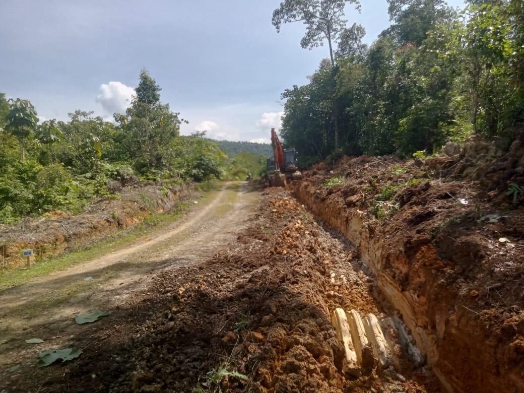 Pekerjaan tidak berhenti pada pembentukan jalan saja. Satgas juga membuat parit di sepanjang sisi jalan sebagai saluran air. Drainase ini berfungsi menjaga stabilitas tanah agar tidak mudah terkikis.
