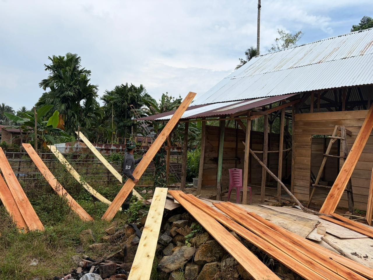 Material papan yang diturunkan langsung di lokasi sasaran menjadi “napas baru” bagi proses pembangunan rumah milik Suhardin. Warga setempat pun turut menyambut dengan antusias, bergotong royong membantu proses bongkar muat hingga penataan material di sekitar lokasi pembangunan.