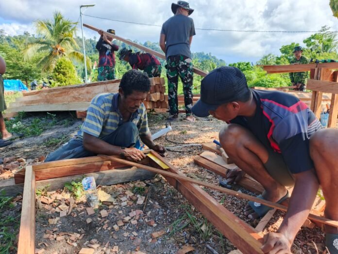 Dalam rangka menjamin kualitas pembangunan RTLH, Satgas TMMD ke-128 Kodim 1801/Manokwari bersama warga melakukan pengukuran kusen pintu dan jendela secara teliti di Kampung Tanah Rubuh, Distrik Manokwari Utara.