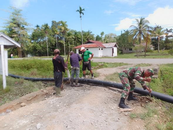 Koptu Zainal Saparang bersama warga bergotong royong memperbaiki pipa air yang mengalami kerusakan, sehingga aliran air bersih yang sebelumnya terhambat dapat kembali mengalir dengan normal ke rumah-rumah warga.