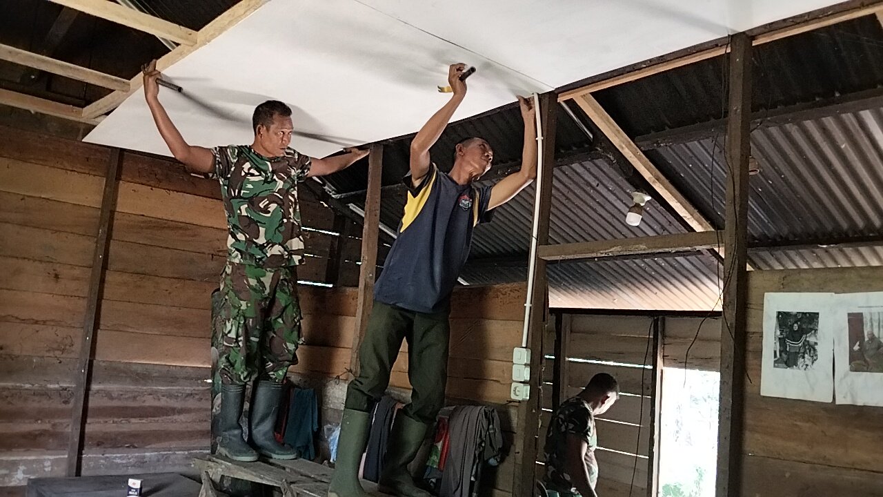 Personel Satgas TMMD tidak bekerja sendiri. Warga sekitar turut turun tangan. Ada yang mengangkat material, ada yang menyiapkan peralatan, sementara yang lain membantu merangkai rangka plafon dengan teliti. Kebersamaan itu menjadi gambaran nyata kemanunggalan TNI dan rakyat yang selama ini digaungkan.