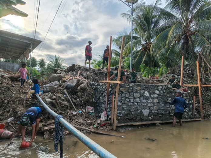 BOALEMO – Semangat gotong royong membuncah di Desa Modelomo, Kecamatan Tilamuta, Kabupaten Boalemo. Di bawah terik matahari, deru alat berat bersahutan dengan dentuman palu godam saat personel TNI dari Kodim 1316/Boalemo bersama Yonif Teritorial Pembangunan (YTP) 915/Bitu’o bahu-membahu mempercepat pemasangan batu pondasi Jembatan Perintis Garuda, Jumat (10/04/2026).