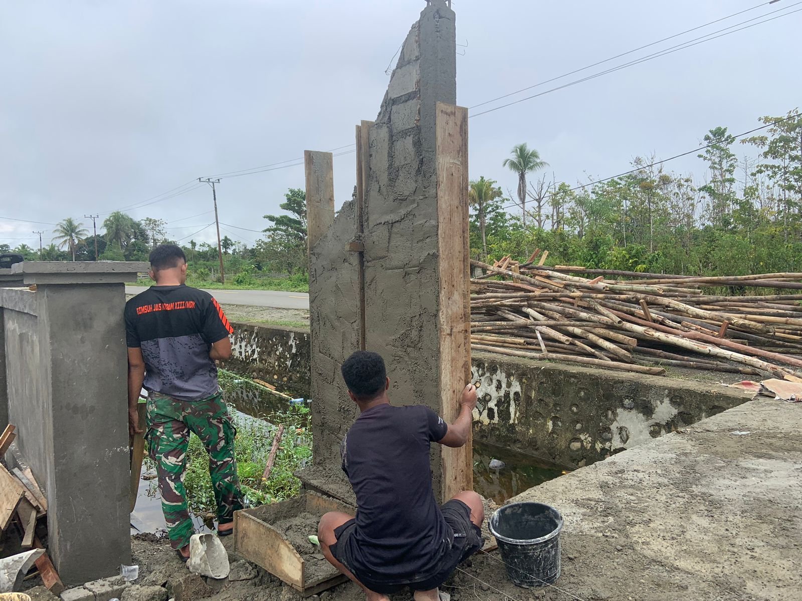 Satgas TMMD bersama masyarakat setempat bahu membahu mengerjakan struktur gapura yang akan menjadi pintu gerbang utama gereja. Keberadaan gapura ini diharapkan tidak hanya memperindah kawasan rumah ibadah, tetapi juga menjadi simbol penyambutan bagi jemaat dan warga yang datang beribadah.