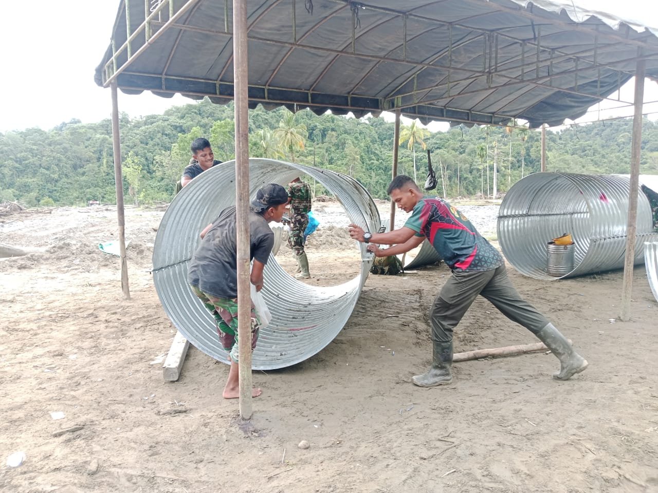 Pada tahapan ini, para prajurit TNI tampak bekerja dengan penuh ketelitian dan kejelian. Perakitan pipa Armco dilakukan dengan menyusun bagian-bagian pipa bergelombang yang kemudian dikoneksikan menggunakan baut baja high tensile guna memastikan kekuatan dan kestabilan struktur secara maksimal.