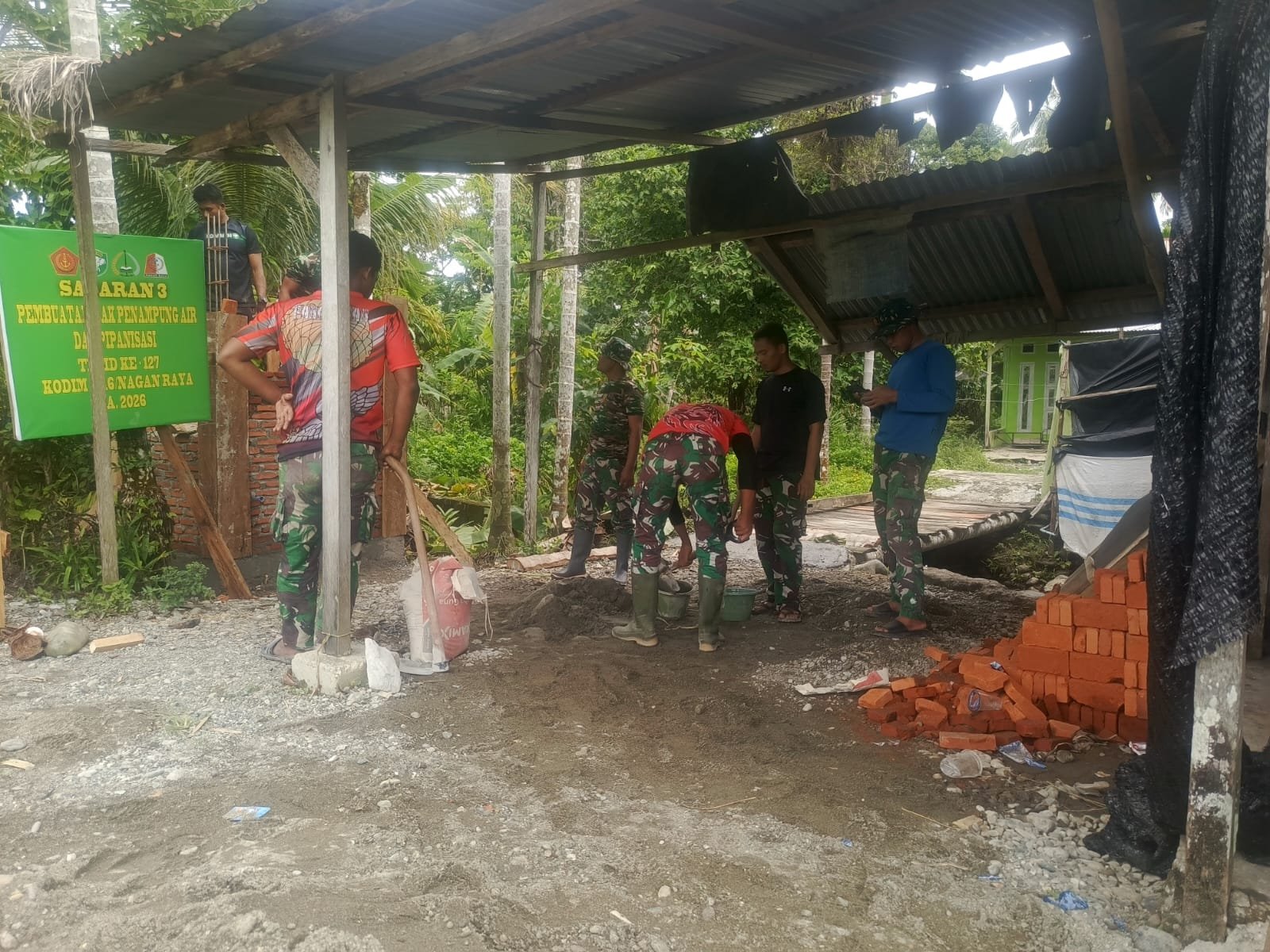 Di lokasi sasaran ketiga pembangunan, anggota Satgas tampak sibuk menyusun bata untuk memperkuat konstruksi tendon penampungan air. Pekerjaan dilakukan secara gotong royong dengan penuh dedikasi demi menghadirkan akses air bersih bagi masyarakat.