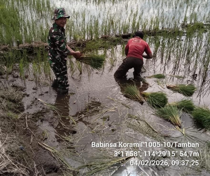 Barito Kuala – Dalam rangka mendukung program ketahanan pangan nasional, Babinsa Koramil 1005-10/Tamban Kopda Darno Kuncoro melaksanakan kegiatan pendampingan Luas Tambah Tanam (LTT) dengan membantu petani menanam padi di wilayah Kecamatan Mekarsari, Kabupaten Barito Kuala, pada Rabu 04 Februari 2026. Kegiatan ini menjadi wujud nyata sinergi antara TNI dan masyarakat dalam memperkuat sektor pertanian sebagai penopang utama kebutuhan pangan daerah.