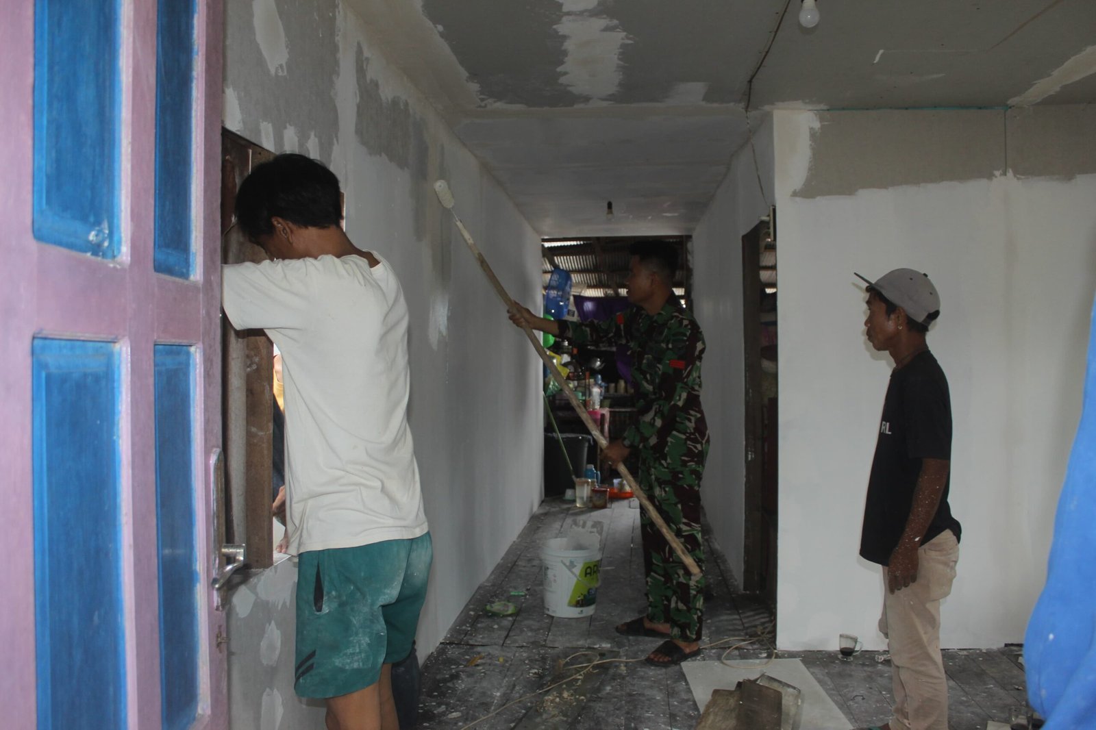 Proses pengerjaan dikerjakan secara gotong royong oleh anggota Satgas dan warga setempat. Mereka bahu-membahu memastikan setiap bagian rumah terlapisi cat dengan rata dan rapi, agar hasil akhir maksimal.