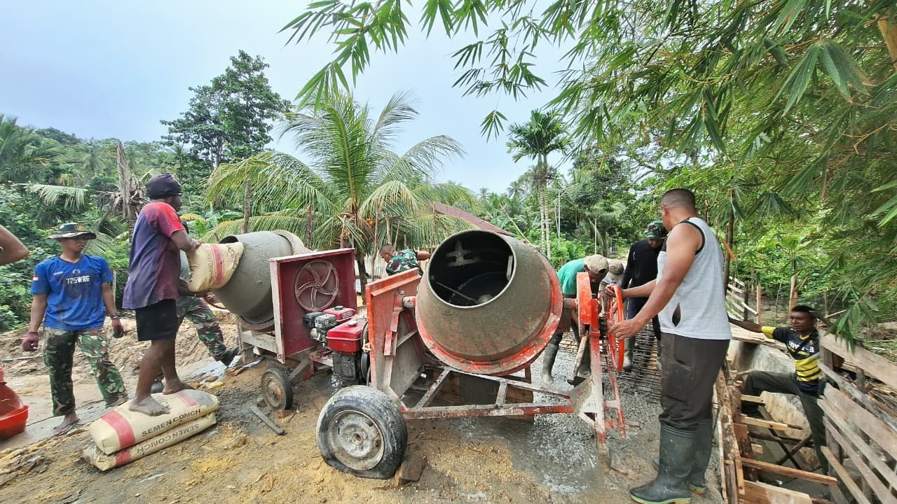 Pembagian tugas antara prajurit dan masyarakat terlihat solid, mulai dari pencampuran material hingga perataan beton agar hasil akhir presisi dan kuat.