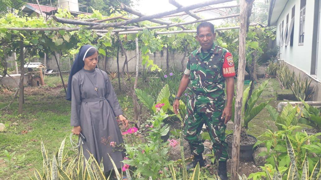 Bersama dengan seorang Suster, Babinsa Serma Duarte memberikan pendampingan sekaligus memberikan petunjuk tentang cara pemberian pupuk pada tanaman anggur disaat musim hujan seperti sekarang ini.
