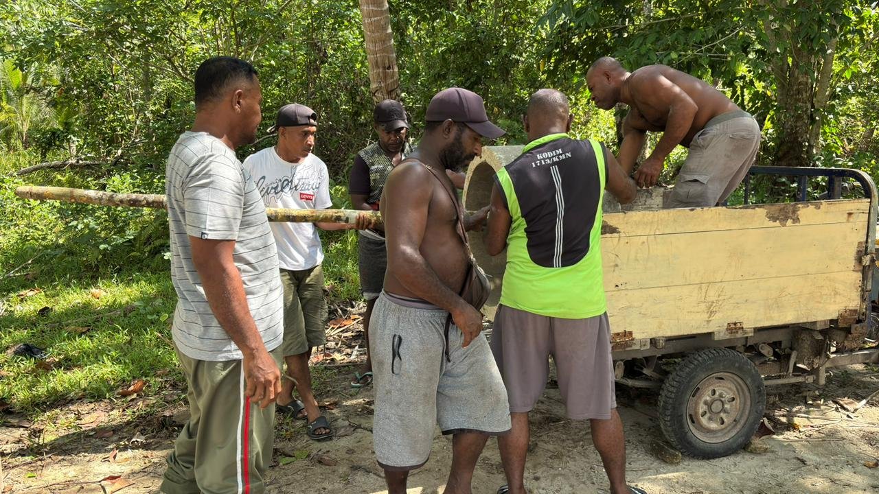 Kaimana – Dalam rangka mempercepat pembangunan sumur, Satgas TMMD 127 Kodim 1804/Kaimana kembali melaksanakan pengangkutan cincin/gorong-gorong di lokasi sumur yang berada di samping Gereja Oraid Labora pada 01/03/2026.