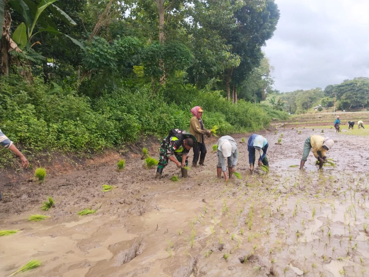 SUMBA TENGAH – Dalam rangka mendukung program ketahanan pangan di wilayah binaan, Babinsa Koramil 03/Katikutana Kodim 1613/Sumba Barat, Sertu Ananias Valentim, melaksanakan komunikasi sosial (komsos) bidang ketahanan pangan dengan membantu warga menanam padi di Desa Matawoga, Kecamatan Katikutana, Kabupaten Sumba Tengah, Selasa (13/01/2026).