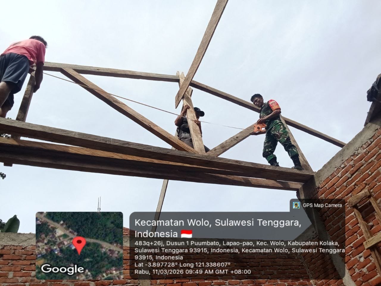 Kolaka – Rabu (11/3/2026). Babinsa Koramil 1412-04/Kolaka, Koptu Suharman, melaksanakan kegiatan karya bakti bersama warga binaan dengan membantu pemasangan kuda-kuda rumah milik Bapak Sukri. Kegiatan tersebut dilaksanakan di Dusun 1, Desa Ulu Lapapao, Kecamatan Wolo, Kabupaten Kolaka.