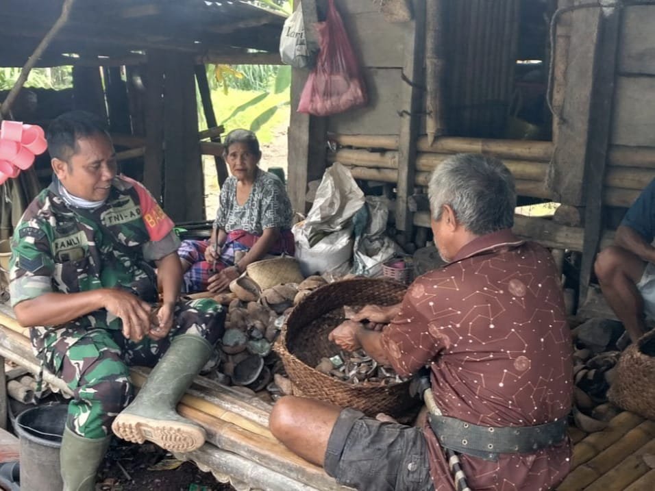 Dalam kesempatan itu, Serka Ramli turun langsung ke lokasi pembuatan kopra dan berdialog dengan warga guna mengetahui kondisi serta kendala yang dihadapi dalam proses pengolahan hasil kelapa.